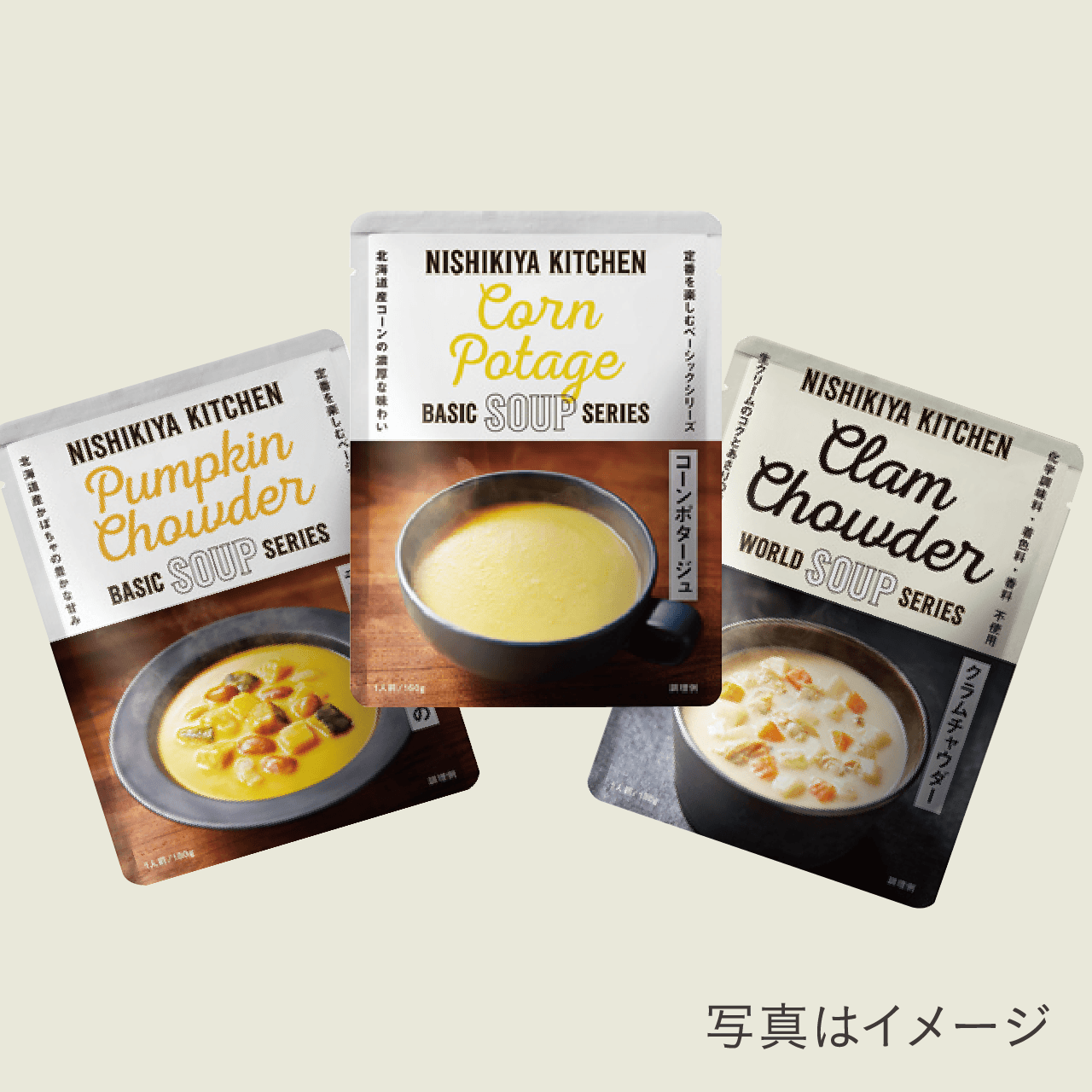 〈NISHIKIYA KITCHEN〉のからだあったかスープセットを3名に。「コーンポタージュ」「クラムチャウダー」「北海道産カボチャのチャウダー」の3点セット。