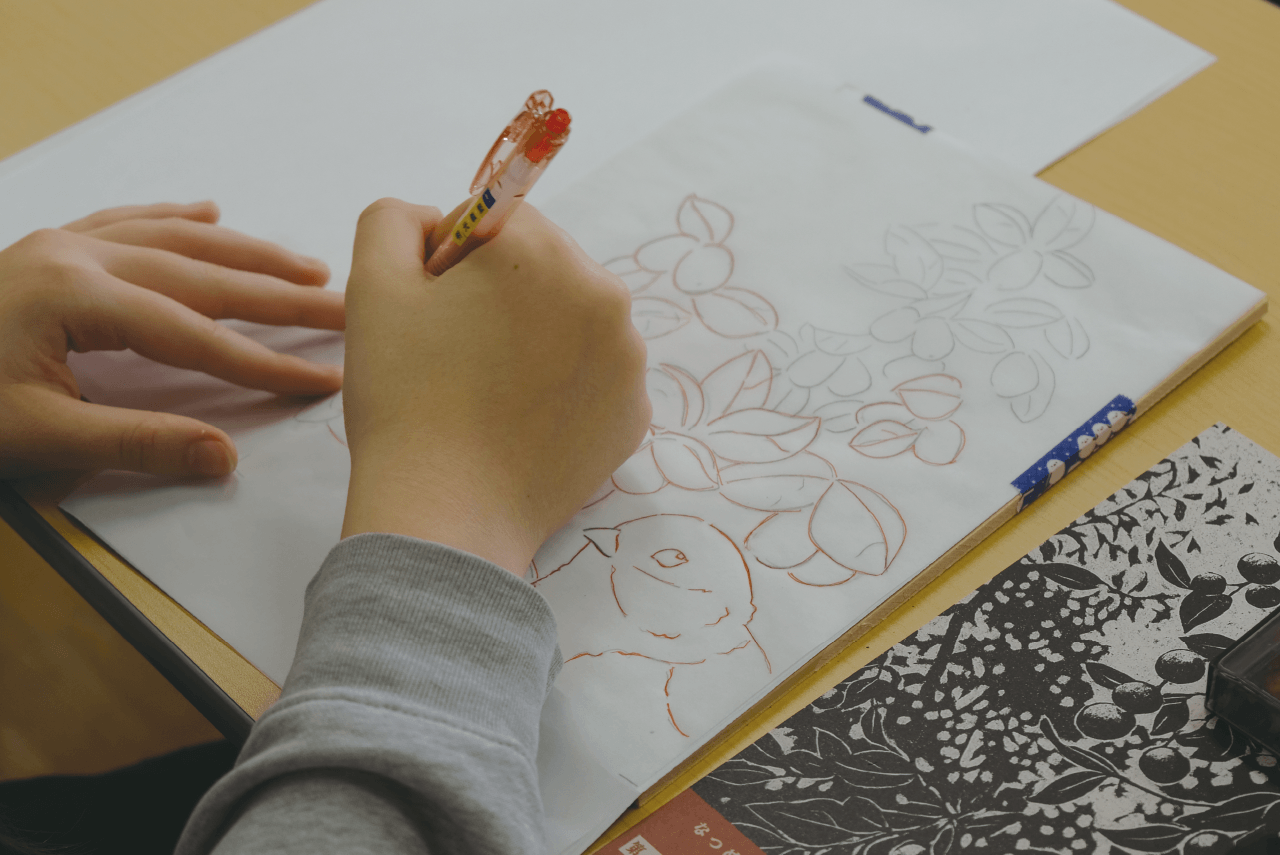 ナツメをテーマに制作した版画を、包装紙として使う試みのワークショップへ。