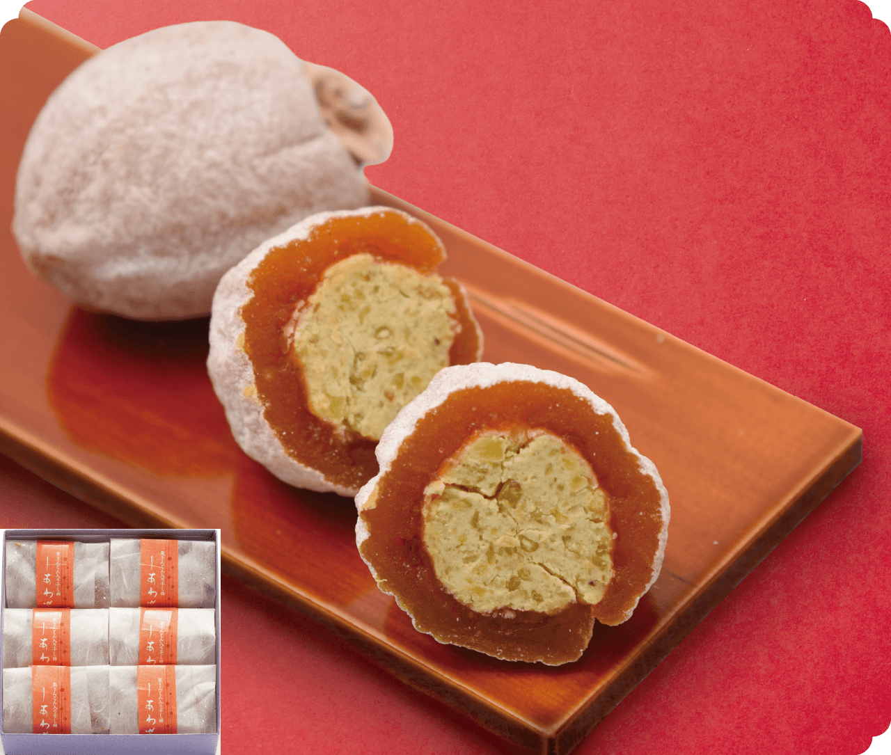上質な干し柿と栗きんとんの組み合わせは、やさしい甘さが口に広がる。用途に応じてラベルを紫色の「おもいで」に変更可。3・6・15・20個入りに対応可。1個400円。6個入り2,550円。