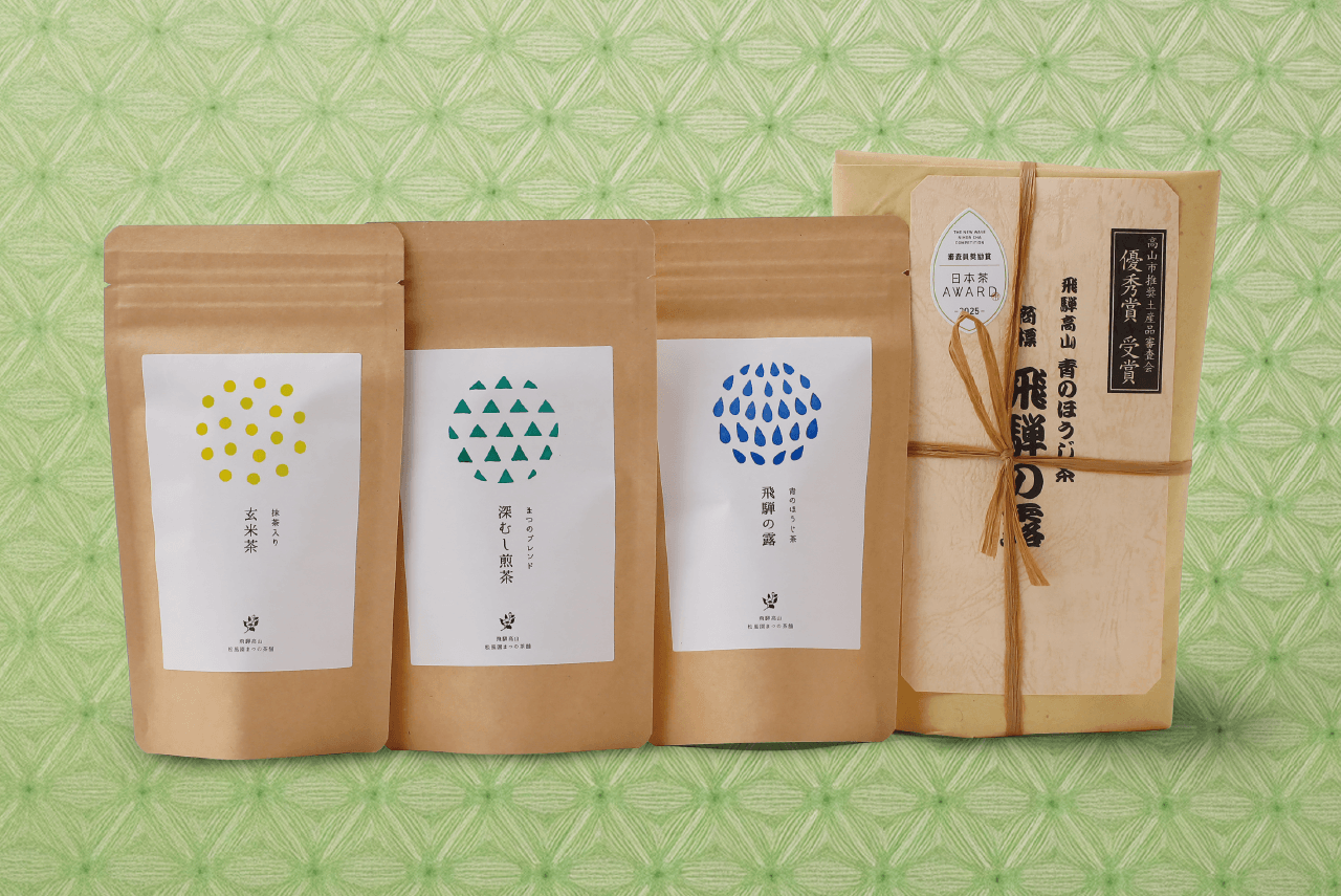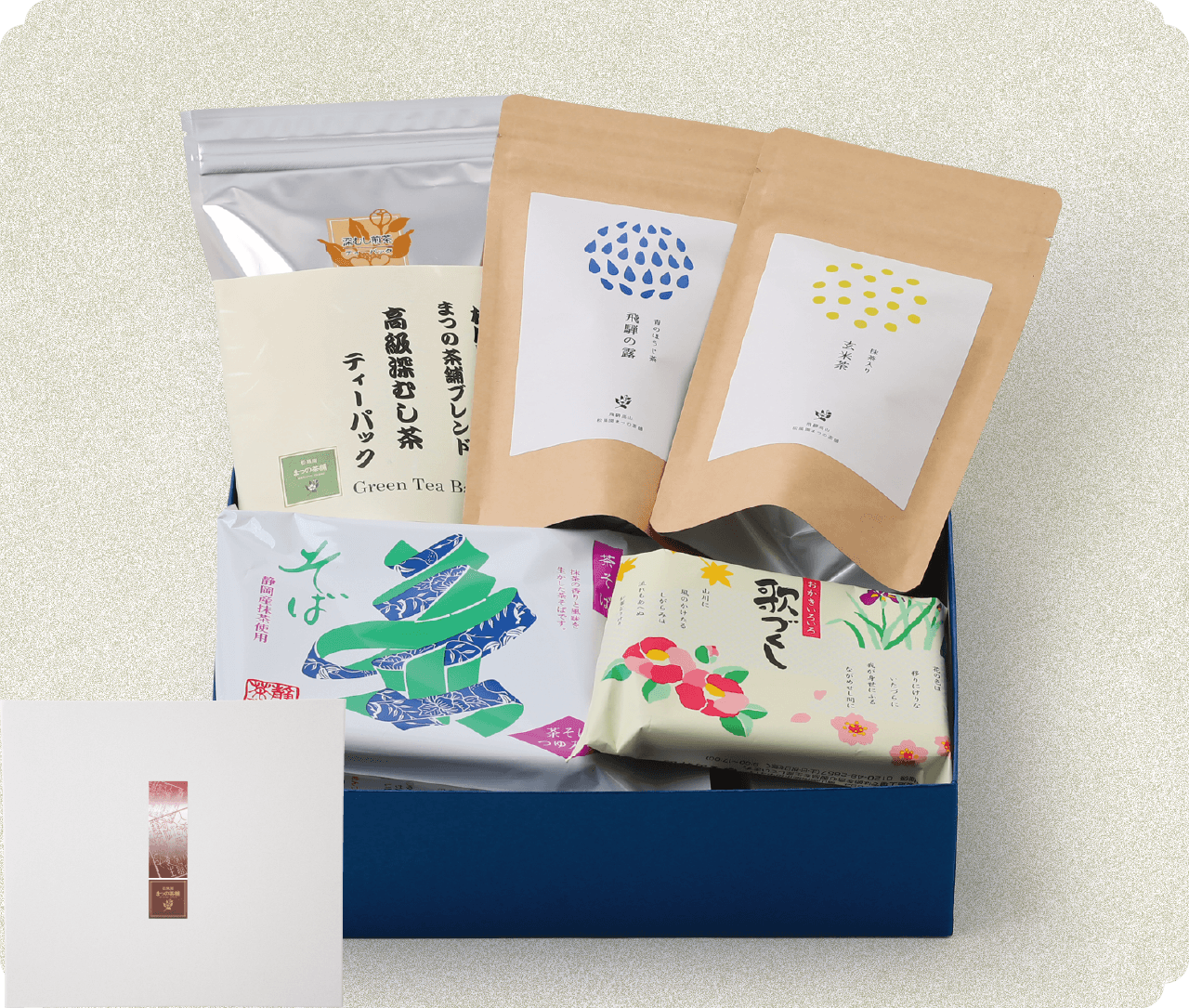 旨みがしっかり感じられる「深むし茶」などのお茶3種とお茶請け、茶そばのセット。茶葉は淹れるのに便利なティーバッグタイプで、手軽に本格的な味わいを楽しめる。3,630円。