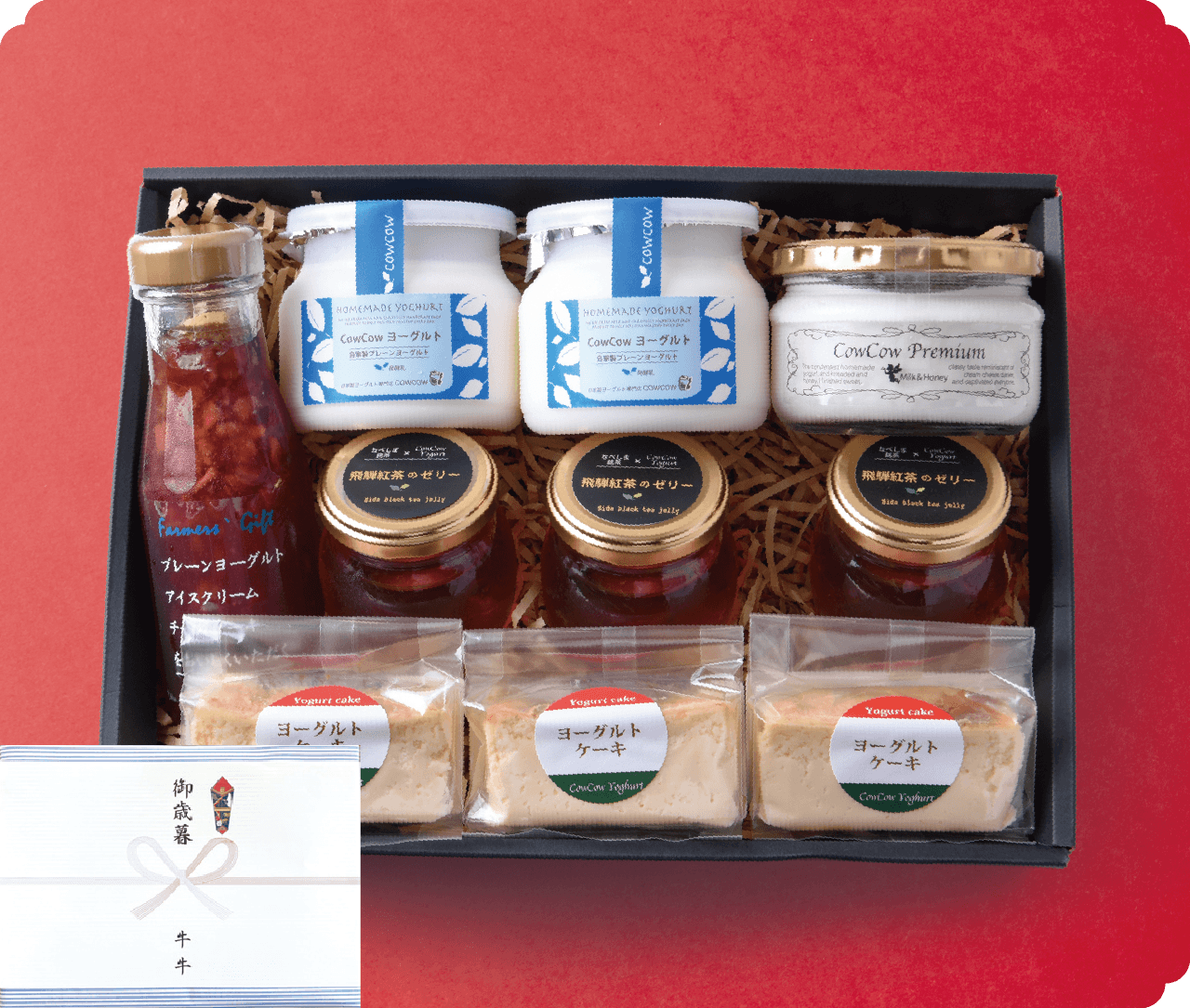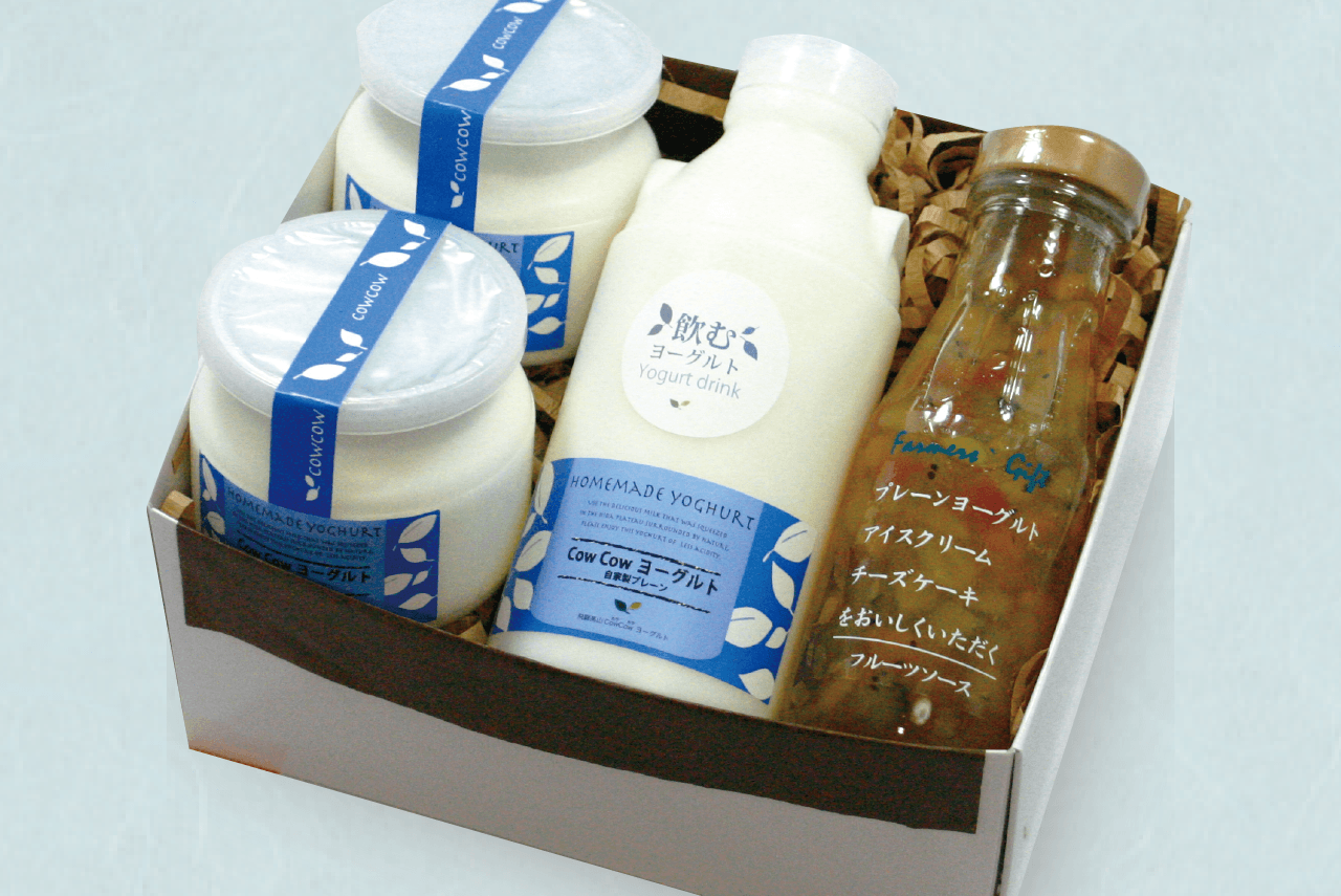 今年の感謝を込めて贈る大切な方へのギフトに、〈自家製ヨーグルト専門店COWCOW〉の体にやさしいスイーツセットを。4,970円。その他、予算や内容に合わせて、好きなアソートでのギフトセットも対応。