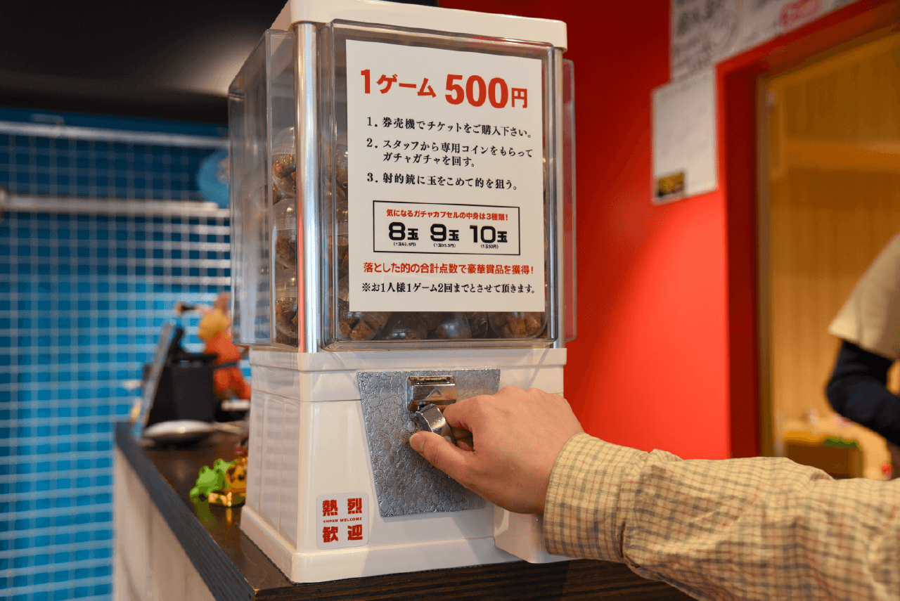 1ゲームは500円。持ち玉の数はガチャガチャで出てくるカプセル次第というのもギャンブル性があって楽しい。運に身を任せていざ勝負!