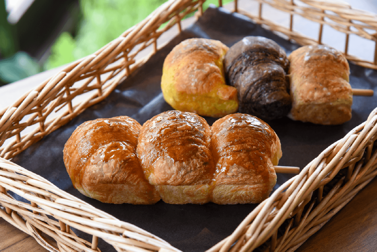 お団子の形のクロワッサンは、棒付きなので食べ歩きにもピッタリ。