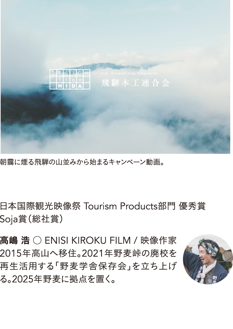 今回のポスタービジュアルに使われたのは、昨秋リリースされた飛騨木工連合会のプロモーション動画「人がつくり、人をつくり、人とある」。映像を制作した、映像作家・高嶋 浩氏にインタビュー!