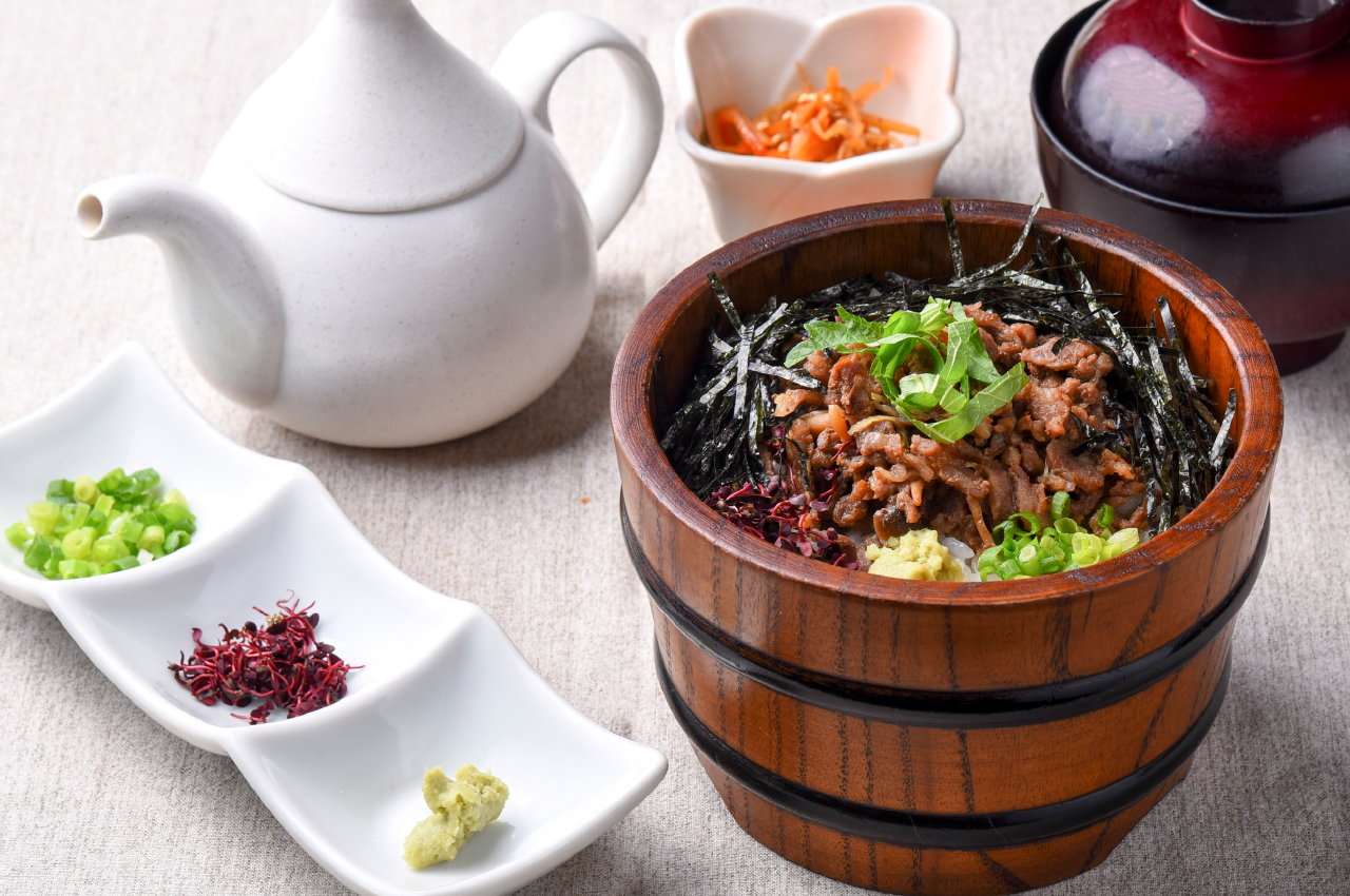 生姜香る飛騨牛のひつまぶし。隠し味の味噌が飛騨牛の旨みを引き立てる。1.そのまま、2.薬味と一緒に、3.お茶漬けでと3段階楽しめるセット。
