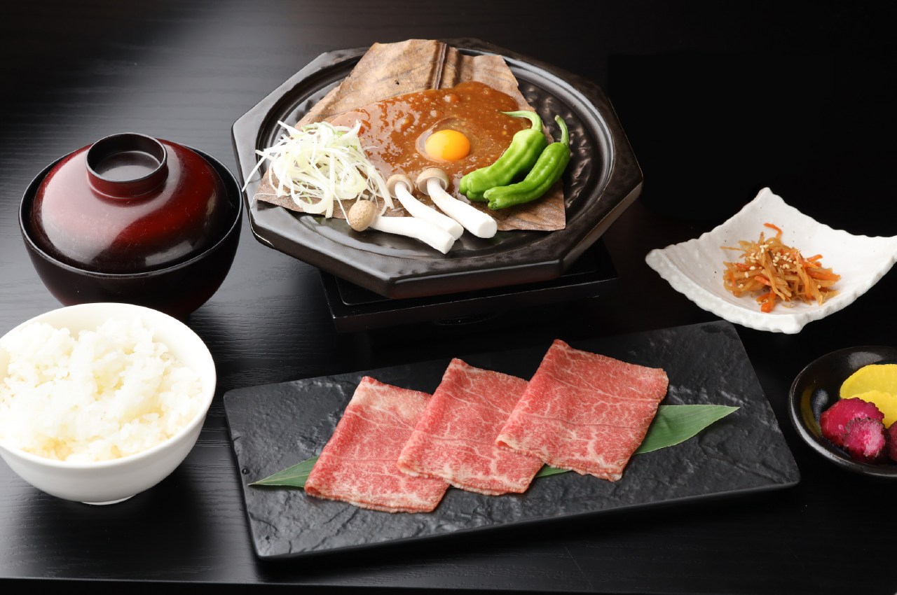 飛騨の郷土料理「朴葉味噌」と、大きくスライスされた特上飛騨牛の黄金の組み合わせ。朴葉の香りがのった味噌を軽く焼いた飛騨牛につけてご飯を巻き巻き、ご馳走定食。