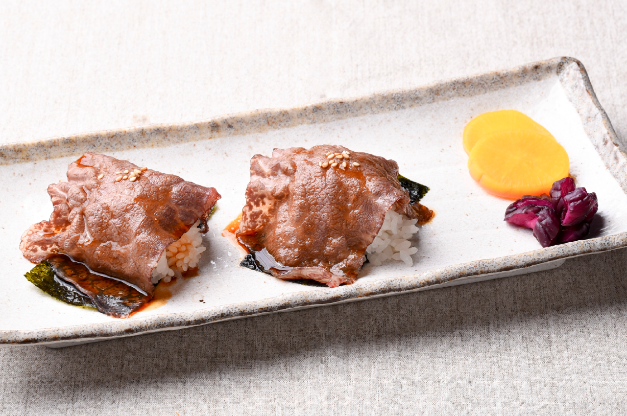 ふっくら炊き上げた飛騨高山産のご飯を、大きくスライスした飛騨牛で贅沢に包み込んだ「飛騨牛肉巻きおにぎり」。特製ダレも相まって肉の旨みとご飯の甘みが絶妙に重なり合い、手軽に極上の美味しさを味わえる逸品。