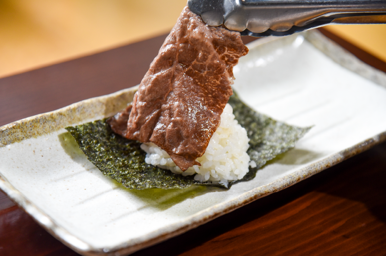 テイクアウトでも人気の「飛騨牛肉巻きおにぎり」は、豊富なメニューと合わせて、お得な「肉巻きセット」でいただける。