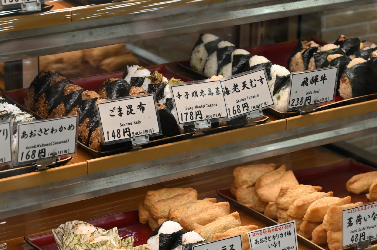 ショーケースに並ぶおにぎりは常時16種類以上でお惣菜は300種を超えるレパートリー。何度通っても飽きない豊富さがうれしい!