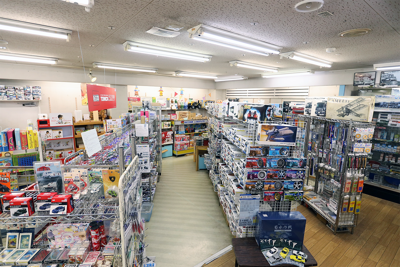 地域の中で長く愛されてきた街の老舗おもちゃ屋。プラモデルやミニ四駆、ボードゲームや知育玩具など、遊び心をときめかせる商品が豊富に揃う。2階にはミニ四駆のコースもあり、休日には子供から大人までが集い、賑わいをみせている。