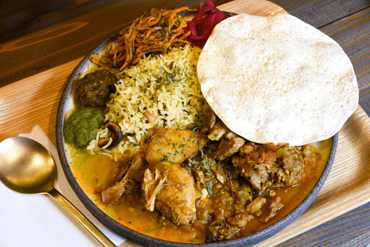 ベルギーワッフルの〈カノコヤ〉が仕掛るスパイスカレーの店〈印度飯店〉。店主がかつて旅したインドで体感した味を5年に渡り地道に探求し、「美味しい」のボーダーを超えるひと皿を完成させた。メニューは季節に合わせて1~2種のカレーと、数種類のアチャールやチャツネにパパドも添えられて、ひと匙食べればもう止まらない。その旨しスパイスカレーを食しに古川へ。