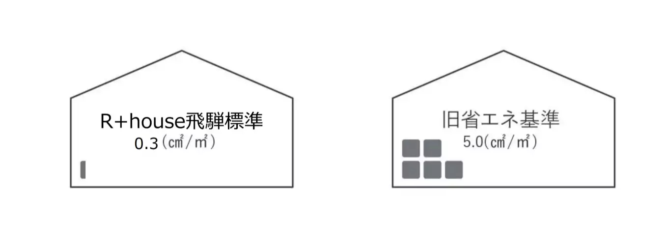 ご説明しますと「C値」とは相当隙間面積のことなんです。ザックリと言うと、家中の隙間を全部集めて足した面積ってことですね。理論上は隙間がない状態をゼロとし、数値が小さければ小さいほど隙間がない気密性の高い家ということになります。旧省エネ基準では5.0(㎤/㎥)と言われている数字ですが、〈R +house飛騨〉では0.3(㎤/㎥)以下をお約束しています。これってそうですね、30坪の家で換算すると、チロルチョコ3個分くらいの面積です。