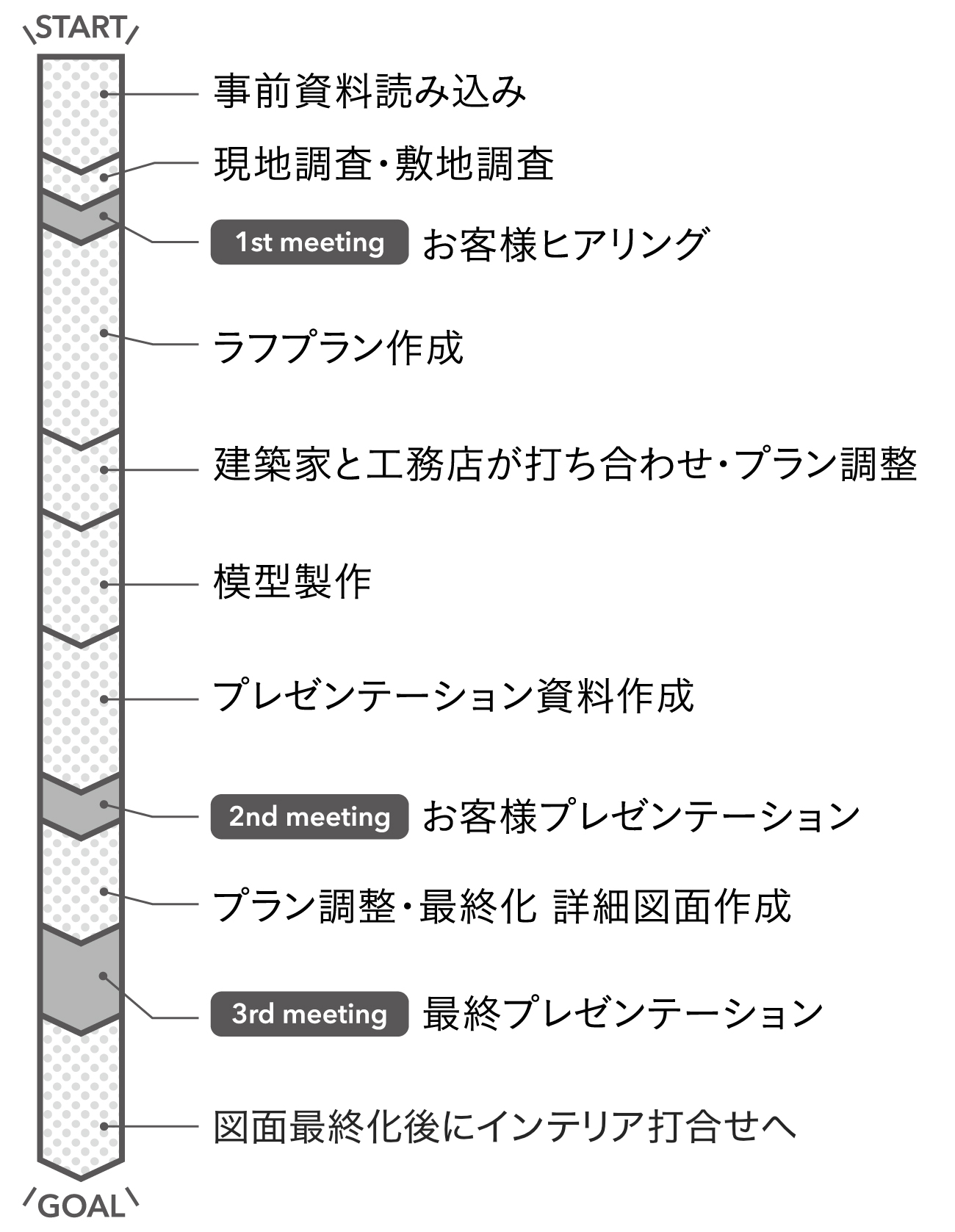そうなんです、設計に取り掛かるとだいたい5~10パターン考えて、その上で絞りに絞った1つを提案させていただくという形になります。しかもこれはよく驚かれるのですが、間取りが完成するまでに建築家との打ち合わせの回数は3回なんです。