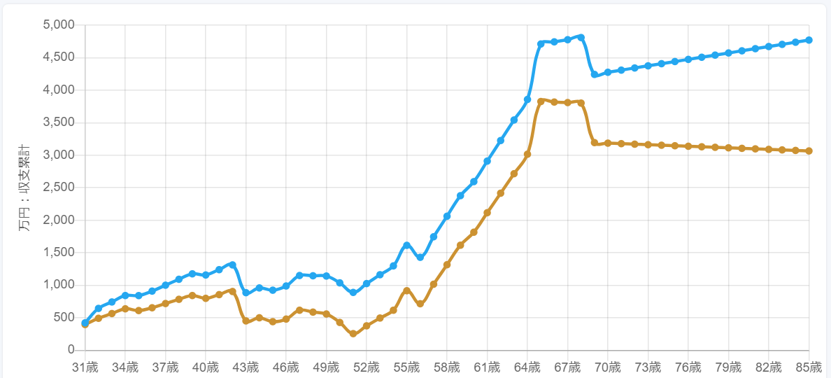 そうなんです、建てる時にこそこれからの一生を暮らす時間を俯瞰して、住んでいる間にかかる光熱費や修繕費といったランニングコストについても一考することは結局は得になるポイントでもありますね。例えばここに、同じご夫婦が2つのパターンでお家を建てたと仮定するグラフがあります。