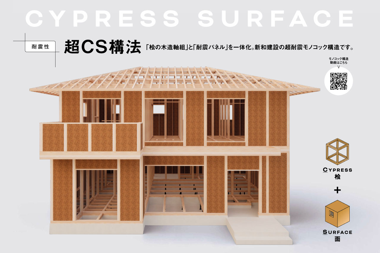 「桧の木造軸組」と「耐震パネル」を一体化した超耐震のモニコック構造で建てる「超CS構法」。